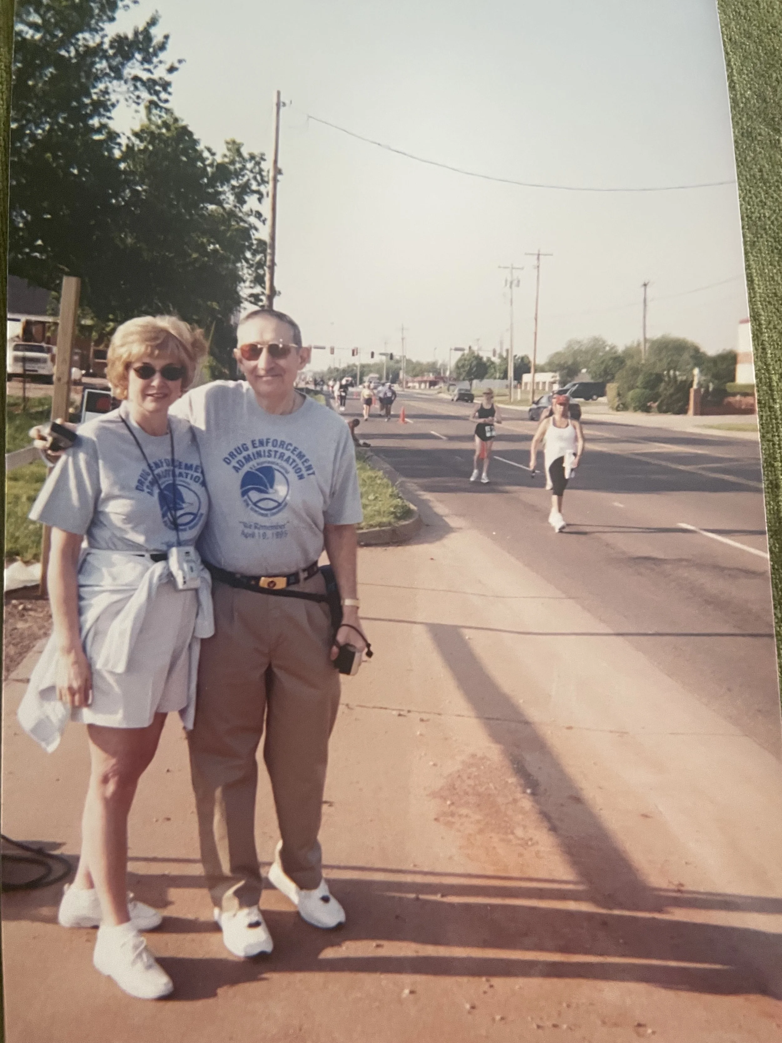 I ran the first marathon with Kenny’s picture printed on the back of my shirt. I took my disposable camera with me and saw a couple with “Drug Enforcement Administration” on their shirts. They had worked with Kenny. I stopped and we shared a few words, and I got their picture. I certainly had no idea that I would return to run the race as a 78- year-old.